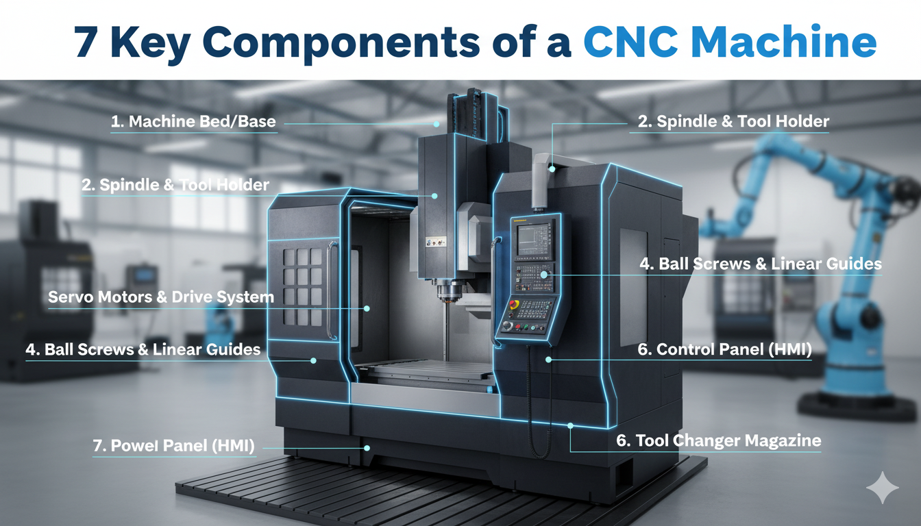 CNC machines have seven Components that are in sync with each other. These are the main components to properly select, operate, and maintain to ensure the precision and productivity of CNC machines in modern manufacturing.